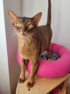 Coquette est une abyssine adorable, très calme, un peu dans la réserve et a besoin de se sentir en confiance pour se lâcher pleinement.